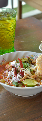 (右)カノムチーン・ナムギャオ ※ランチメニューより…コッテリ&軽い酸味の飽きの来ないスープ、骨付き豚、鶏足、様々な野菜や薬味など具が満載。カオソーイと並ぶ北タイの名物ヌードルだが、取材者は断然こっちが好き。