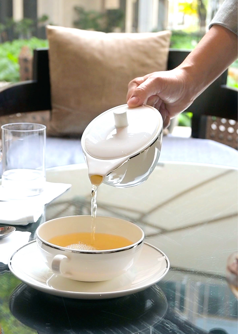 フォーシーズンズのラウンジは、バンコクでも屈指の贅沢な雰囲気。窓の外には緑で覆われた池、インフィニティプール、そして雄大なチャオプラヤー川の景色が広がります。