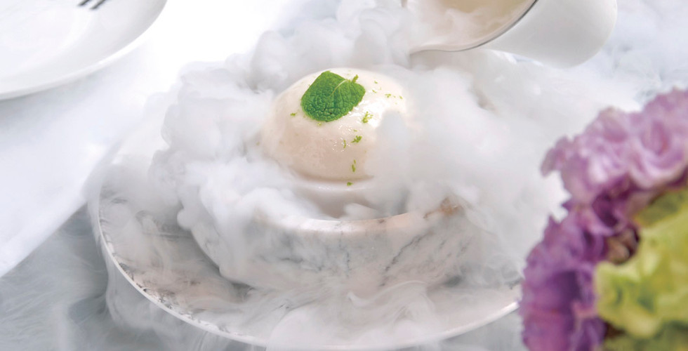 ピンクグァバのソルベとライチゼリー ライムのフォーム添え
